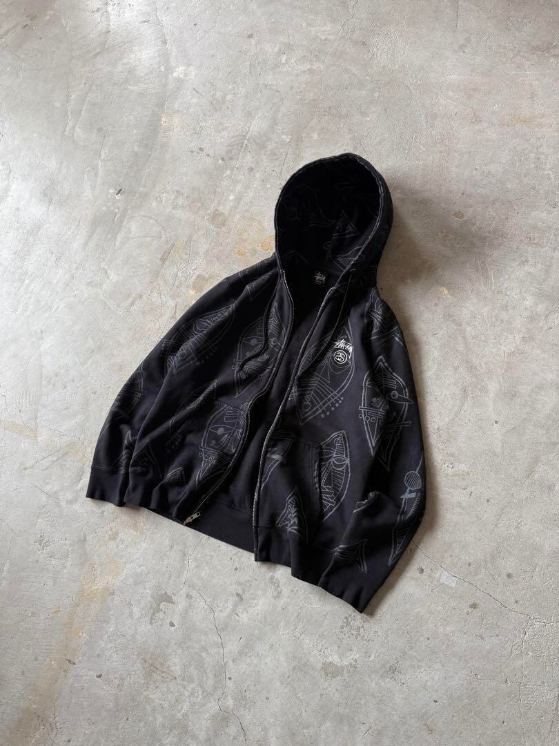 存在感抜群のステューシー総柄ジップパーカー。マスクモチーフのトライバルデザインが全面に施され、ブランドらしいカルチャー色の強い一着。程よい厚みのスウェット地にフロント刺繍ロゴ入り。色味が白と黒なのでめちゃくちゃ派手、というわけではなくファッションに落とし込みやすいかと。