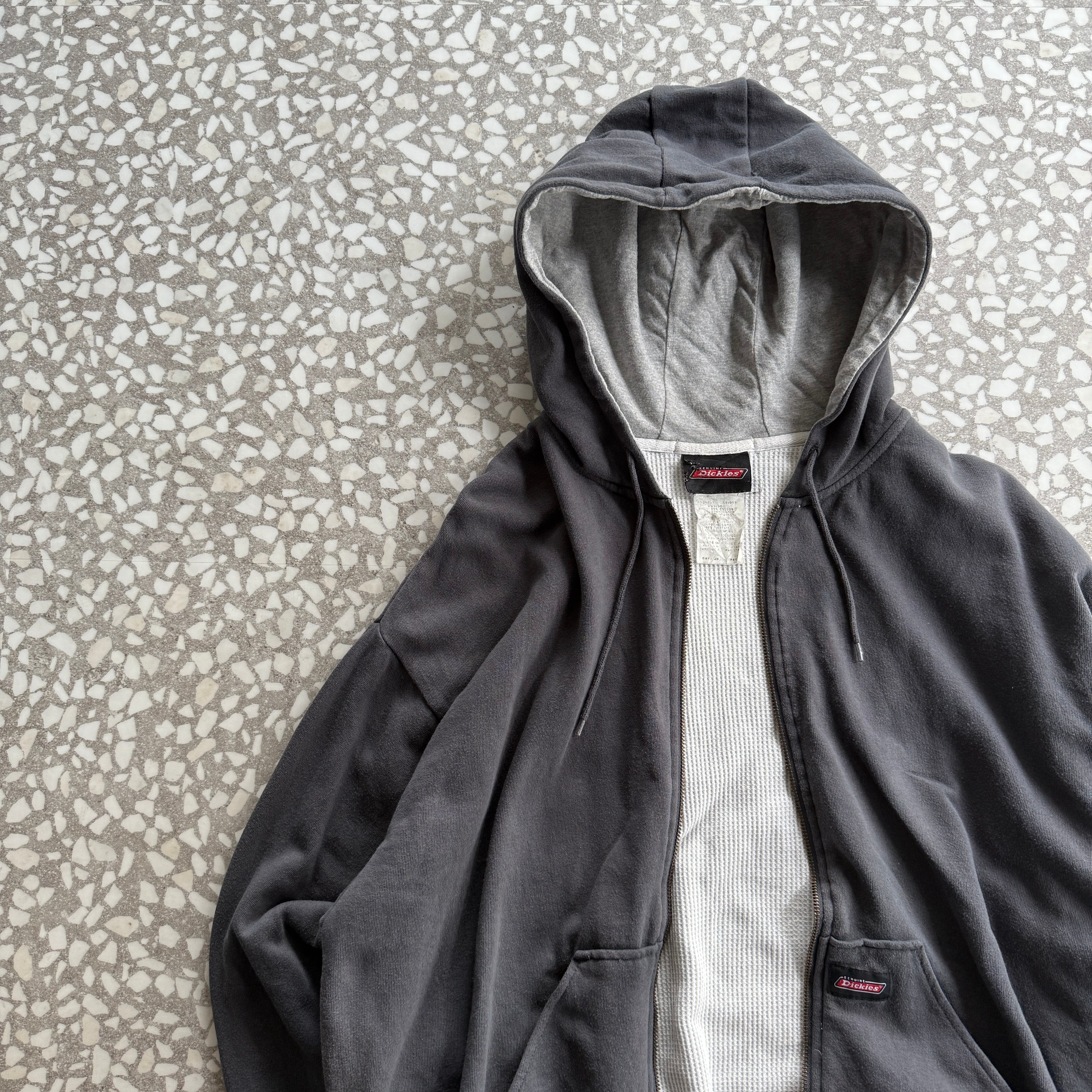 ちょい古ディッキーズのダブルフェイスジップパーカー。裏サーマルなのはもちろん、身幅広すぎずボックスシルエットで綺麗な感じに着こなせます◎ストリートスタイルにもワークスタイルにも相性抜群。ゆったりとしたシルエットでレイヤードにも重宝します。