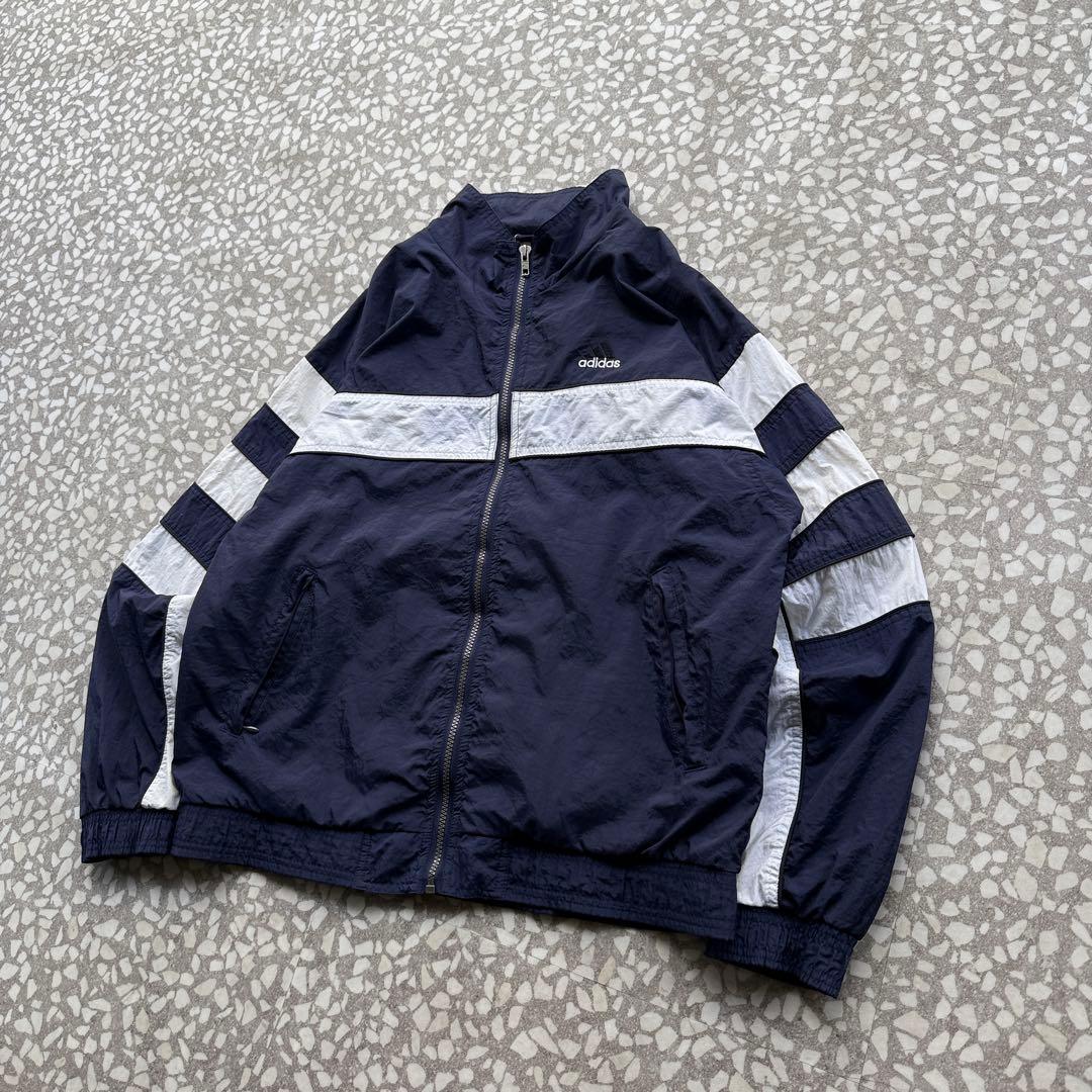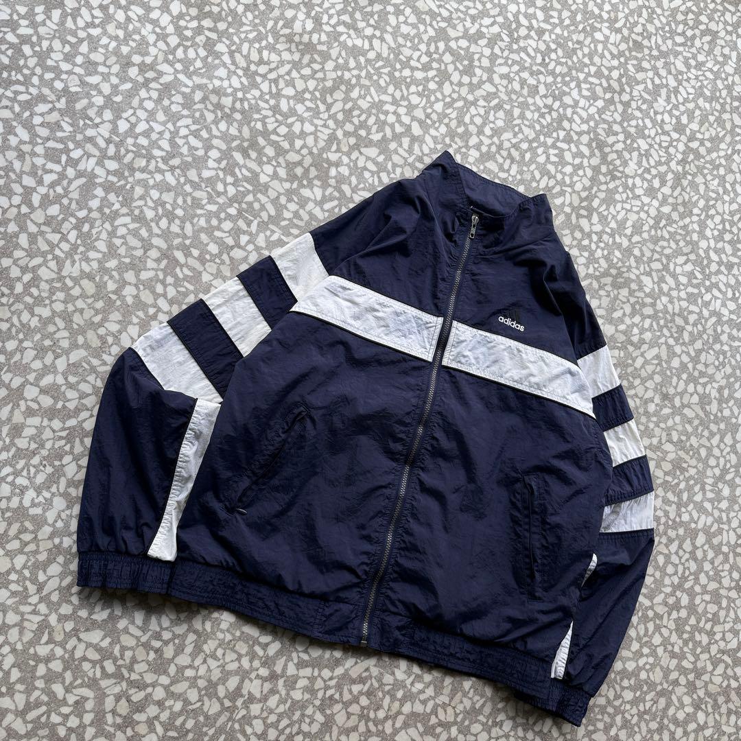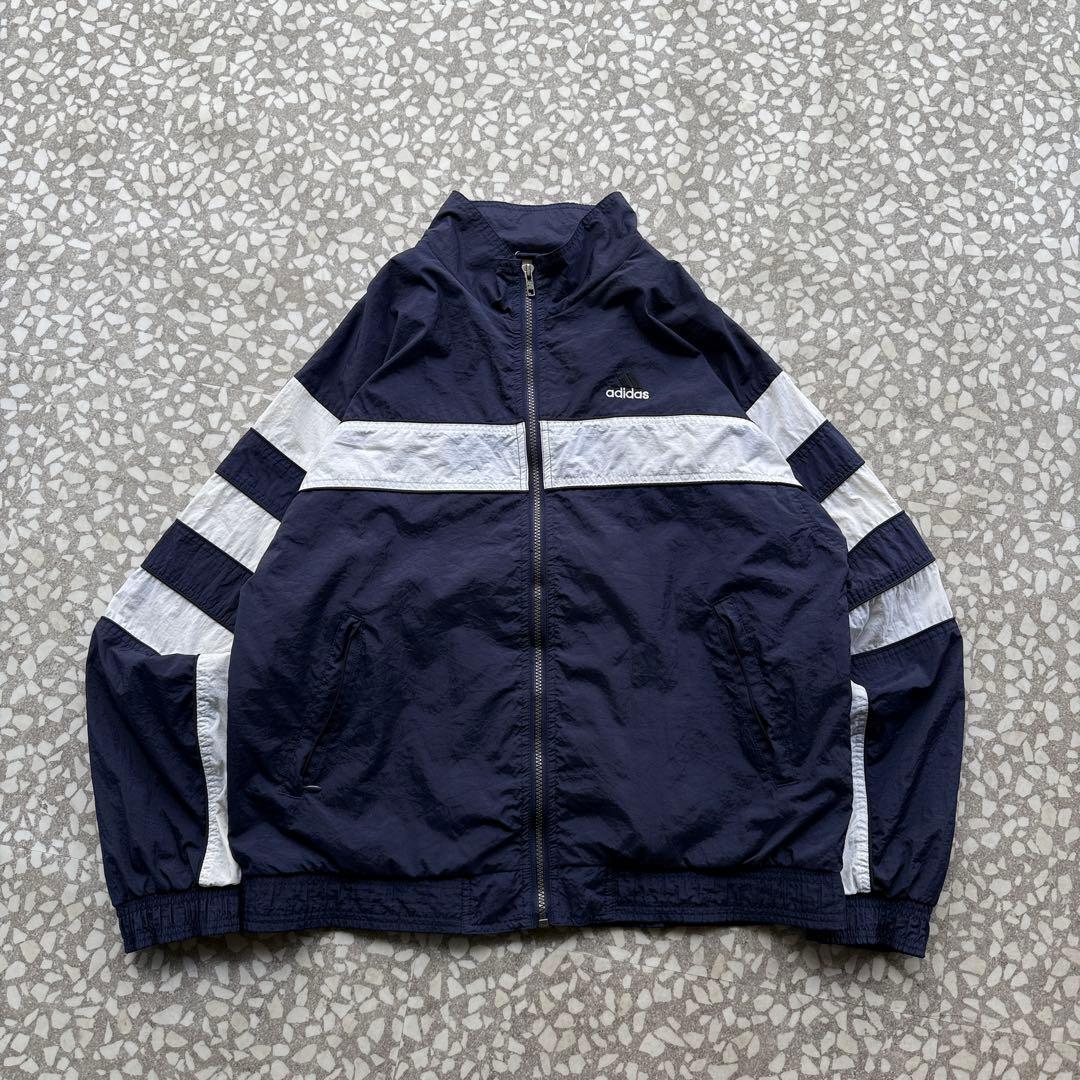 90年代〜2000年代初頭の空気感が漂う、オールドadidasのナイロンジャケット。ネイビーボディにホワイトラインを効かせた王道スポーツデザインで、胸元には刺繍ロゴ入り。万国旗タグ付きの当時モノらしい一着です。軽量なナイロン素材でレイヤードもしやすく、デニムやワイドパンツと相性抜群。