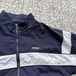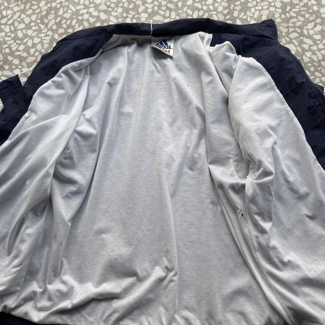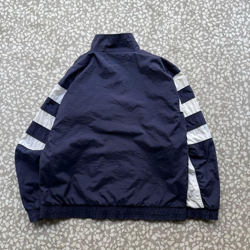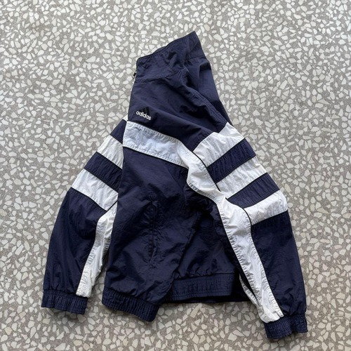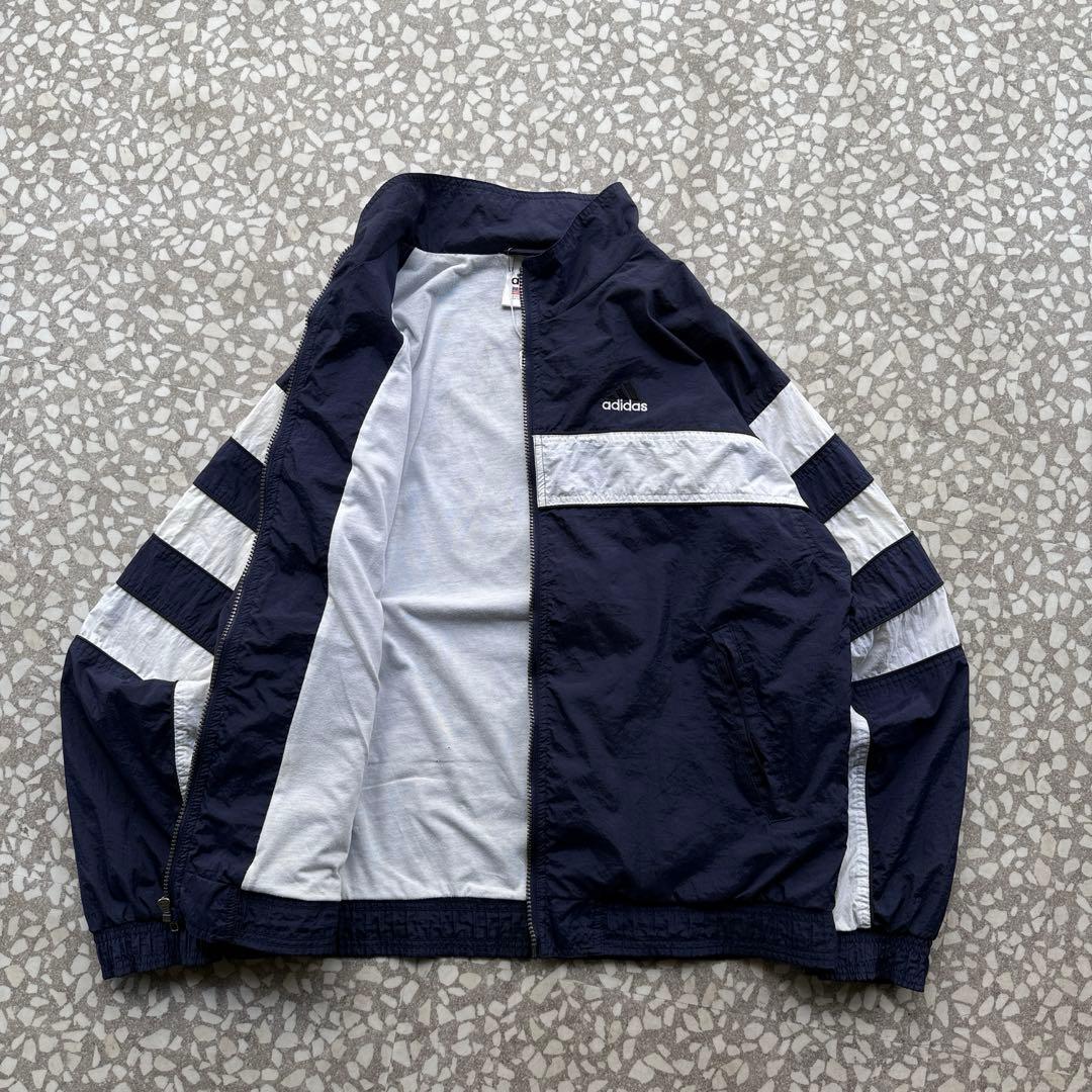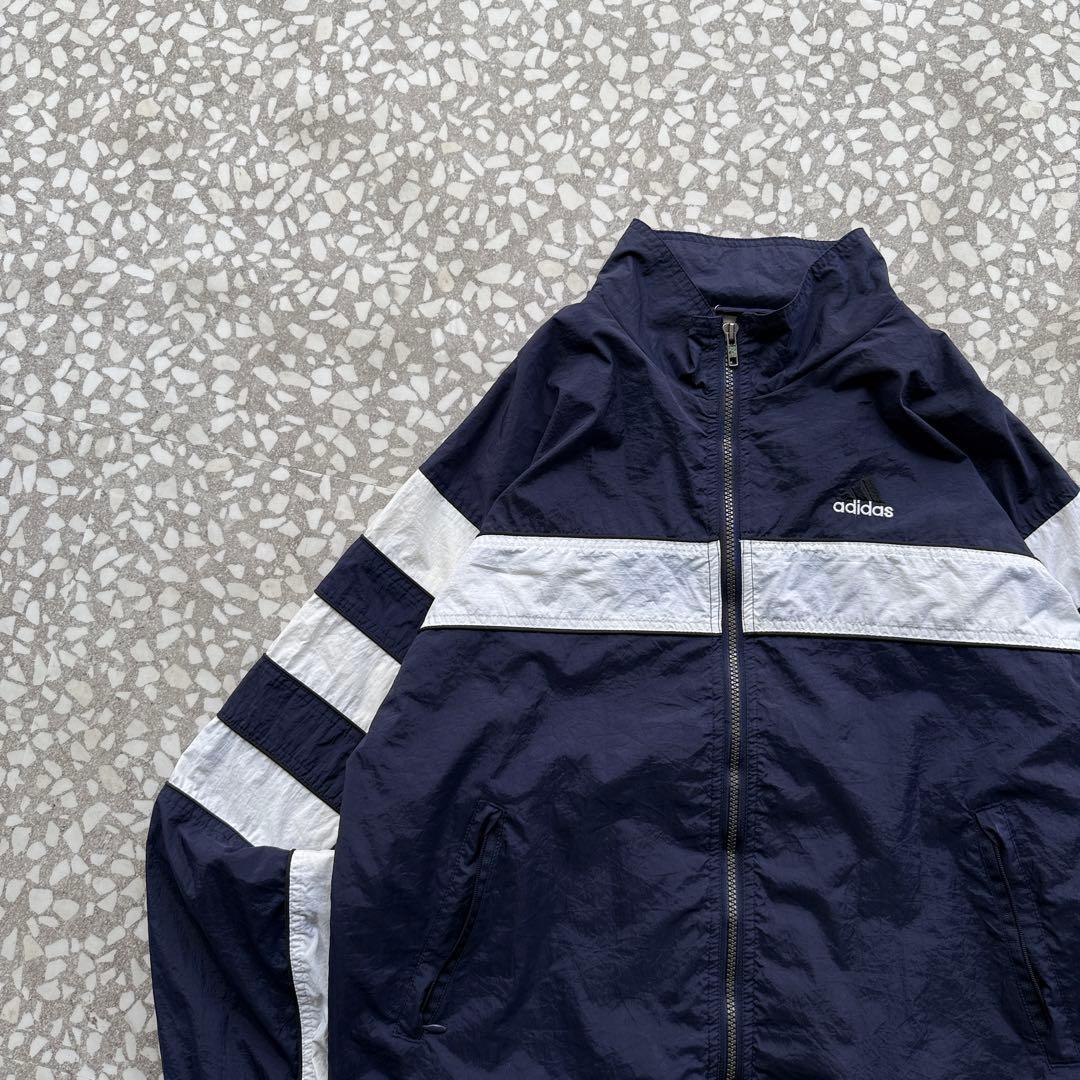 90年代〜2000年代初頭の空気感が漂う、オールドadidasのナイロンジャケット。ネイビーボディにホワイトラインを効かせた王道スポーツデザインで、胸元には刺繍ロゴ入り。万国旗タグ付きの当時モノらしい一着です。軽量なナイロン素材でレイヤードもしやすく、デニムやワイドパンツと相性抜群。