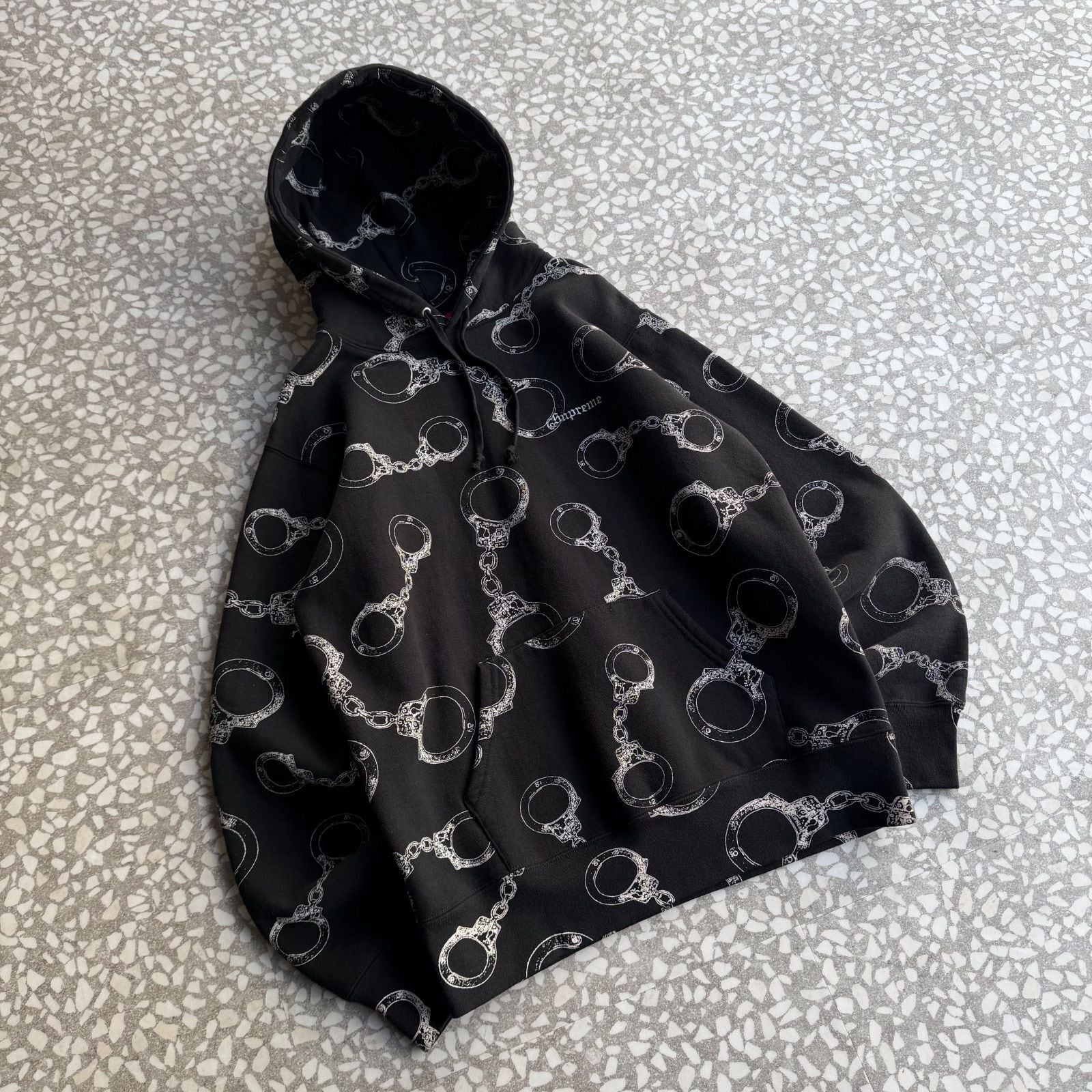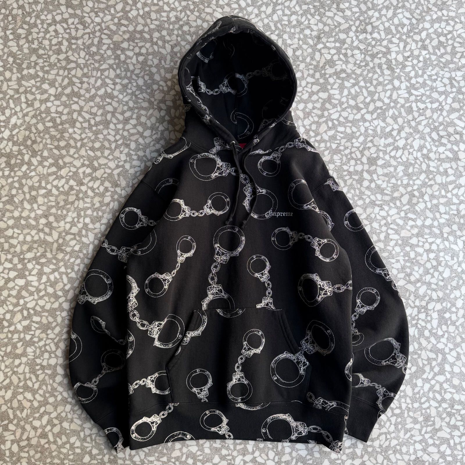シュプリーム ワンポイント刺繍ロゴ 総柄ロゴ 手錠 肉厚パーカー ストリート